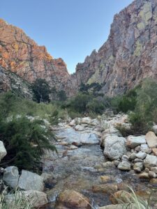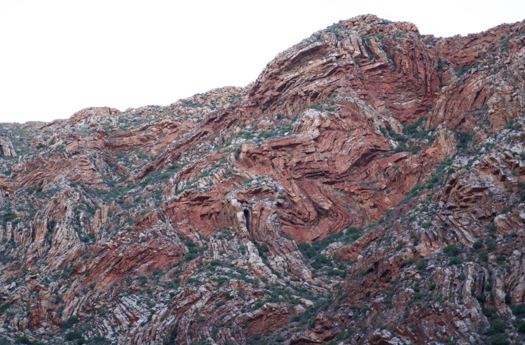 Swartberge is een bergrug in de Kaapse Plooigordel, die van het oosten naar het westen van Zuid-Afrika loopt. De officiële uitleg van waar we zijn. Want op de plek zelf word je volledig omringd door aardlagen die honderden meters omhoog zijn opgestuwd en opgekruld – melted earth: rots gesmolten als glas. Een baarmoeder waarin kristalhelder water ruist.