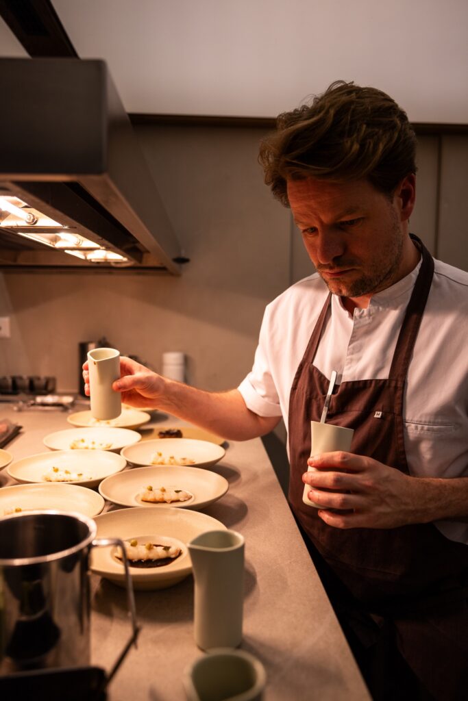 At the table, this philosophy took on a tangible form through the careful precision and striking softness with which everything was composed. We were joined by brand ambassador Yoël van Eer and brand manager Philippine Journée, who hosted the evening with warmth – without direction or didacticism, but with a powerful sense of storytelling. The new visual identity was not only presented, but experienced: in the structure of the evening, the rhythm of the courses, the trust placed in the ingredients, and the subtle accompaniment of small artworks by Eva Lynen, who hand-painted the bottles in vibrant colours on the night itself.