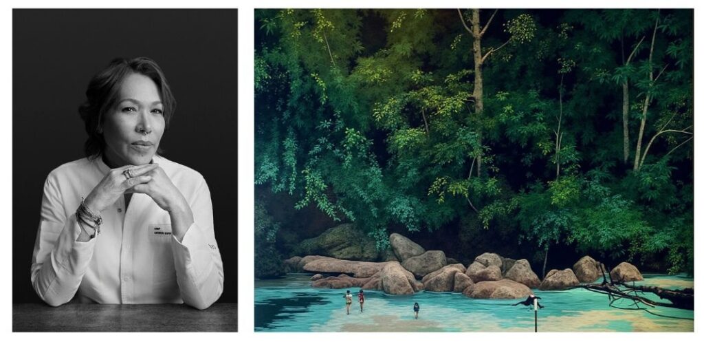 Leonor Espinosa, Chef and founder of Restaurante Leo in Bogotá, artist and founder of FUNLEO foundation: ‘There would be no Restaurante Leo without art. In this work, Nohemí Pérez evokes the innocence of childhood through children bathing in a pool like those of her youth in Colombia’s Catatumbo region, only to disturb the purity of the blue water with a dark oil stain – a stark symbol of the violence and extraction that have scarred this land. The pool, still used by families seeking brief moments of calm despite fear, is also a site of oil spills from attacks on the Caño Limón-Coveñas pipeline; each time it is stained with blood or oil, the community cleans it, a simple yet heroic act of resistance and restoration.’