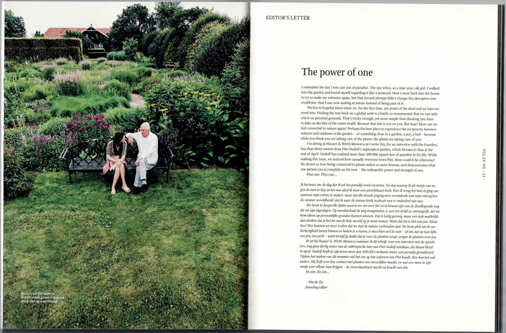 It’s the summer of Piet Oudolf. Throughout four seasons, we have worked together with the renowned landscape designer on this Paradise Found issue and its parallel summer exhibition at our new home in Amsterdam – for which he has specially designed a canalside garden: the Amsterdam Low Line (see page 82). Celebrated worldwide for his naturalistic gardens such as the High Line in New York, Oudolf’s approach to gardening has revolutionised our own relationship to the outdoors. His 100.000 square feet of gardens worldwide have opened our eyes to the power of the perennial garden, one which maintains its splendour in every season. In this issue, we question what it means to be in nature: what it does for us and how we can fall into its rhythm. Join us as we step into Oudolf’s world and rediscover Eden.