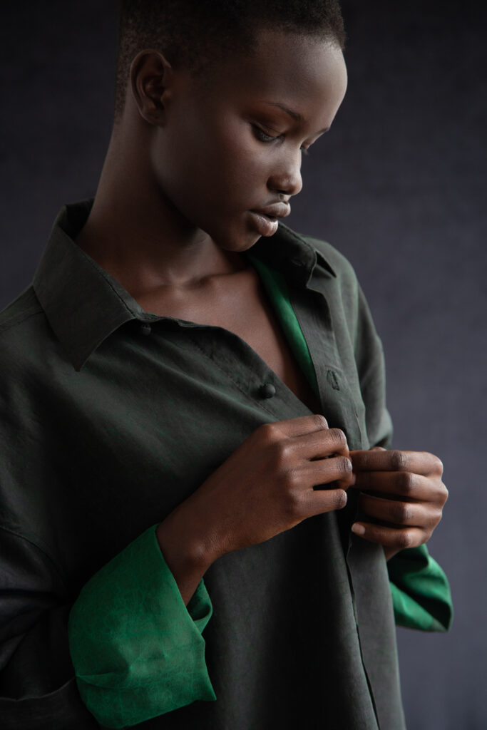 This painter’s blouse is available in two different finishes: satin or habotai silk. Both fabrics are treated with mud, but they differ in appearance. Satin is glossy and sleek, while habotai is sturdier, with a fresh, lightly cracked texture. The model in the photo is wearing the blouse in habotai silk.