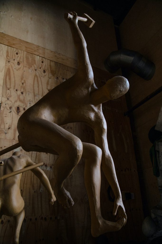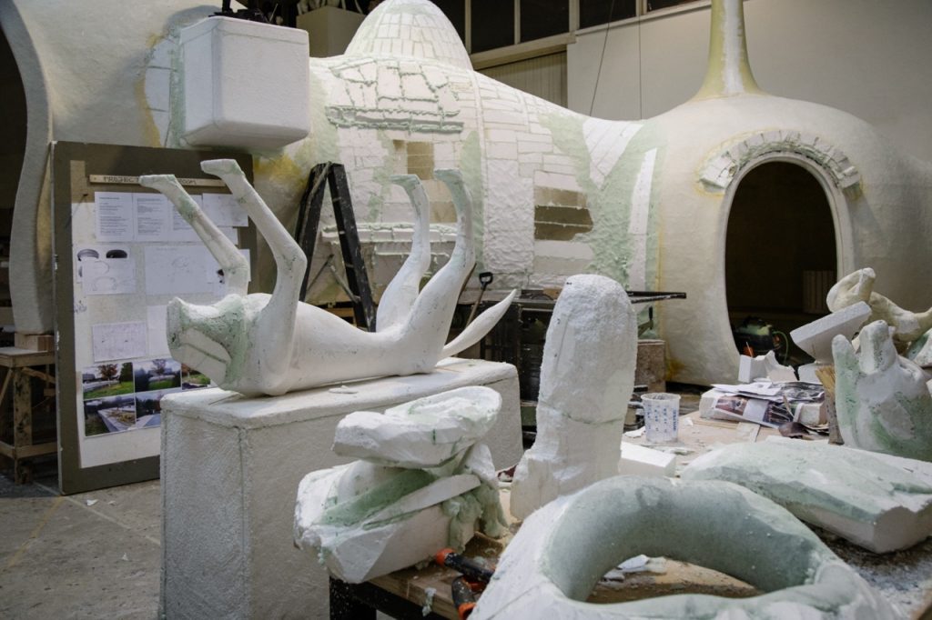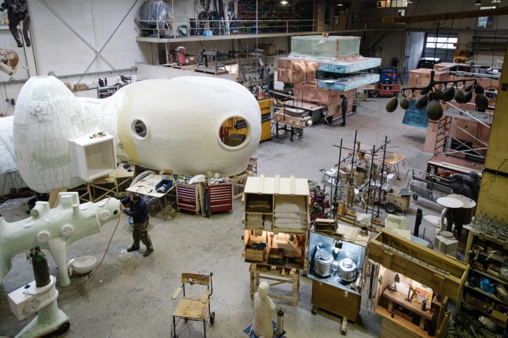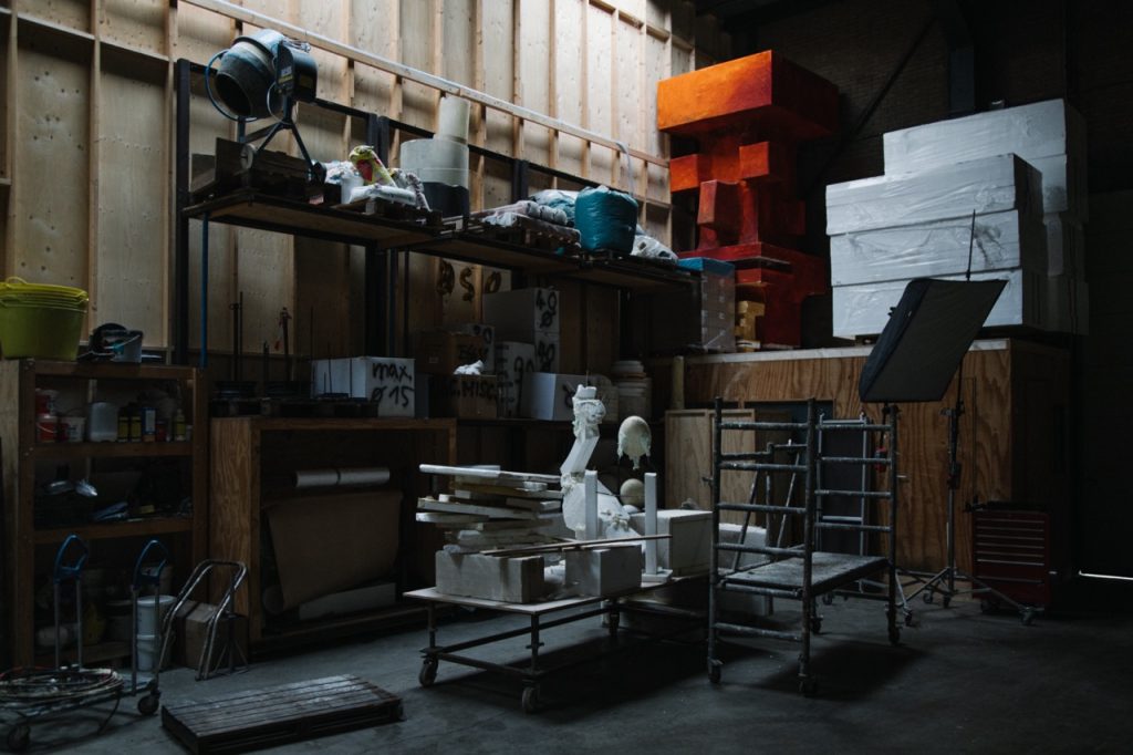 Het is een koude woensdag in januari en Joep van Lieshout – gekleed in een groene tuinbroek en een met witte verf bespikkeld werkjasje – loopt door zijn immense industriële werkhal, waar dagelijks lasapparaten fonkelen, slijptollen razen en schuimpistolen gieren. De overweldigende ruimte is grofweg ingedeeld per materiaal: hier hout, daar staal en weer iets verder polyester, en overal zijn mensen aan het werk, die kriskras door elkaar lopen en samen een team vormen dat werkt voor Atelier Van Lieshout. In deze ruimte wordt niet zozeer geschapen als wel gemaakt. Hier wordt een stelling geponeerd: die twee zaken komen op hetzelfde neer.