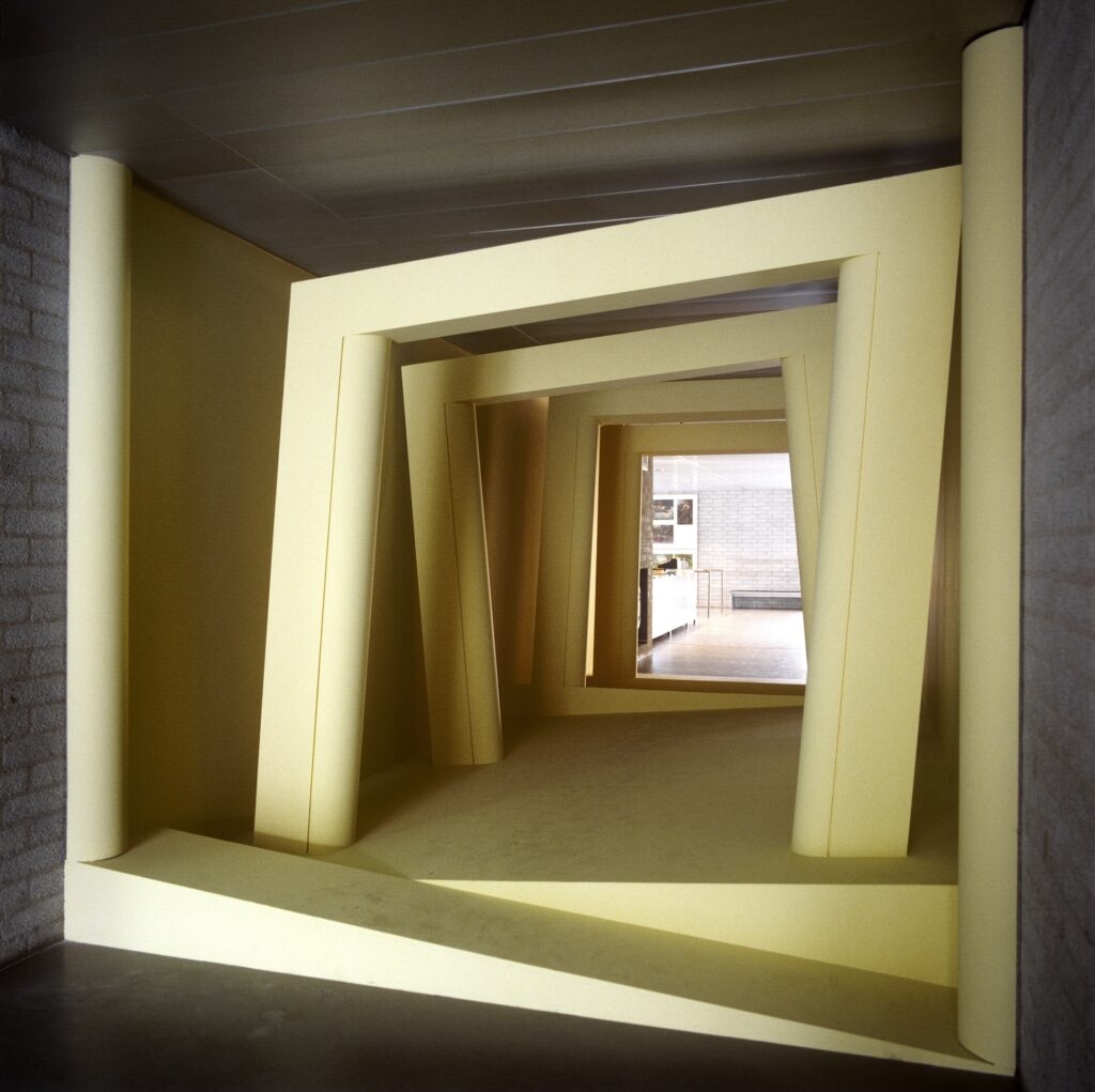 De installatie verspert de doorgang voor de bezoeker. Wil je de rest van de tentoonstelling zien, dan moet je door de botten heen. ‘Bone Curtain dwingt je tot interactie. Dat vindt misschien niet iedereen altijd prettig, zoals een ritueel dat ook niet voor iedereen is. Voor sommigen kan het ontwrichtend zijn. Anderen zullen denken: eindelijk.’ Of neem Topoestesia, van Gianni Colombo, een schots en scheef architectonisch gevaarte dat is ingepast in een van de doorgangen. ‘Dat doet iets met je gevoel voor evenwicht, en er is sprake van een zeker struikelgevaar. Het is bijna alsof je een oude mijn of grot inloopt. Je moet het wel durven.’ Dat niet iedereen dit comfortabel vindt, dat hoort bij het kunstwerk.