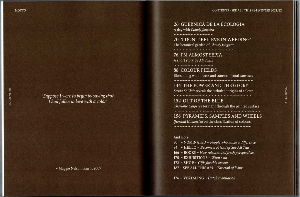 Kleur maakt een comeback in dit dubbeldikke, tweetalige winternummer van See All This. Gastcurator, kunstenaar en activist Claudy Jongstra, brengt met dit nummer kleur terug in ons leven. Met de wol van haar Drentse heideschapen en de planten uit haar eigen botanische tuin creëert ze monumentale textielwerken die getuigen van de schoonheid en het belang van het kleurenpalet van de natuur. Dit nummer is gewijd aan kleur. Aan eindeloze kleurvelden. Met kunstenaars en auteurs die kleur over het hele spectrum vieren.